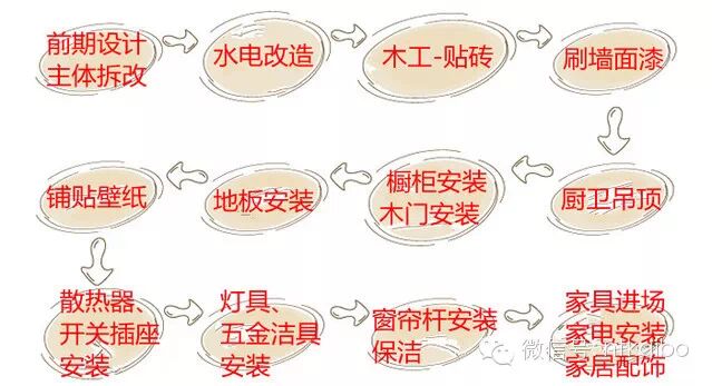 1前期设计——2主体拆改——3水电改造——4木工——5贴砖——6刷墙面漆——7厨卫吊顶——8橱柜安装——9木门安装——10地板安装——11铺贴壁纸——12散热器安装——13开关插座安装——14灯具安装——15五金洁具安装——16窗帘杆安装——17拓荒保洁——18家具进场——19家电安装——20家居配饰