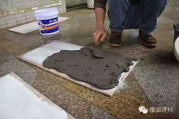 3、用高质量的楼固超强瓷砖粘结剂均匀涂刷在清理干净的瓷砖背面,厚度约为1mm,待不流动时即可上墙。
